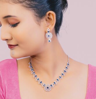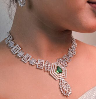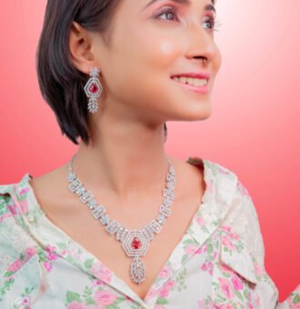 “This premium CZ American Diamond necklace and earring set showcases a gemstone in centerpiece with an elegant geometric design. Perfect