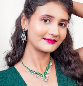 Elevate luxury with this emerald green necklace set, accented with micro-set CZ stones and a striking green gemstone drop. Matching