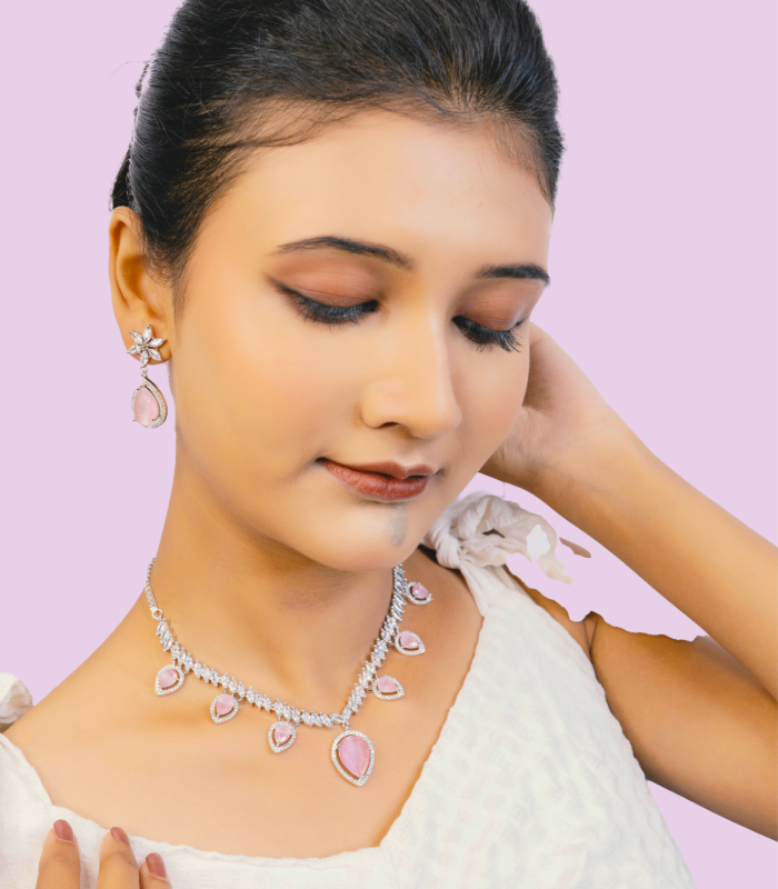This sleek necklace set features a platinum-tone finish with dazzling American diamonds for a contemporary look. Lightweight yet sturdy, it’s crafted for modern fashion markets worldwide.