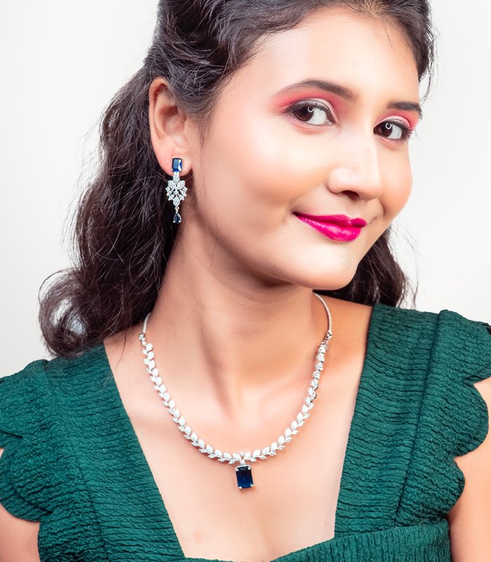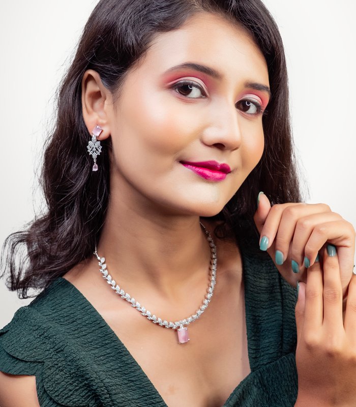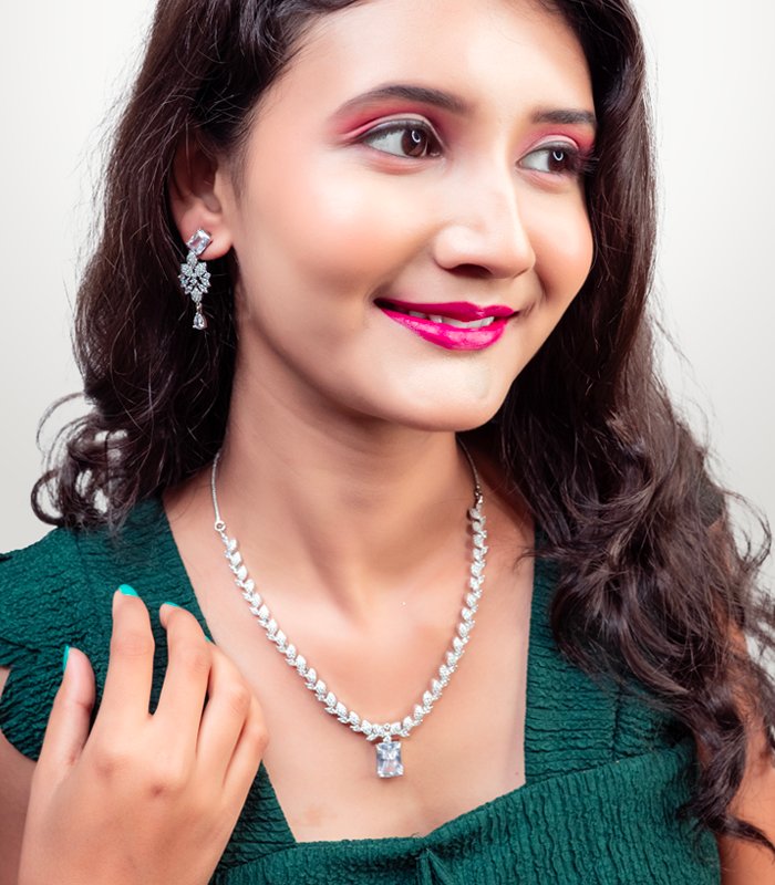 Luxury meets affordability with this CZ American Diamond necklace set. Designed for weddings, receptions, or formal evenings, this wholesale jewelry collection ensures global buyers access to high-quality fashion pieces.